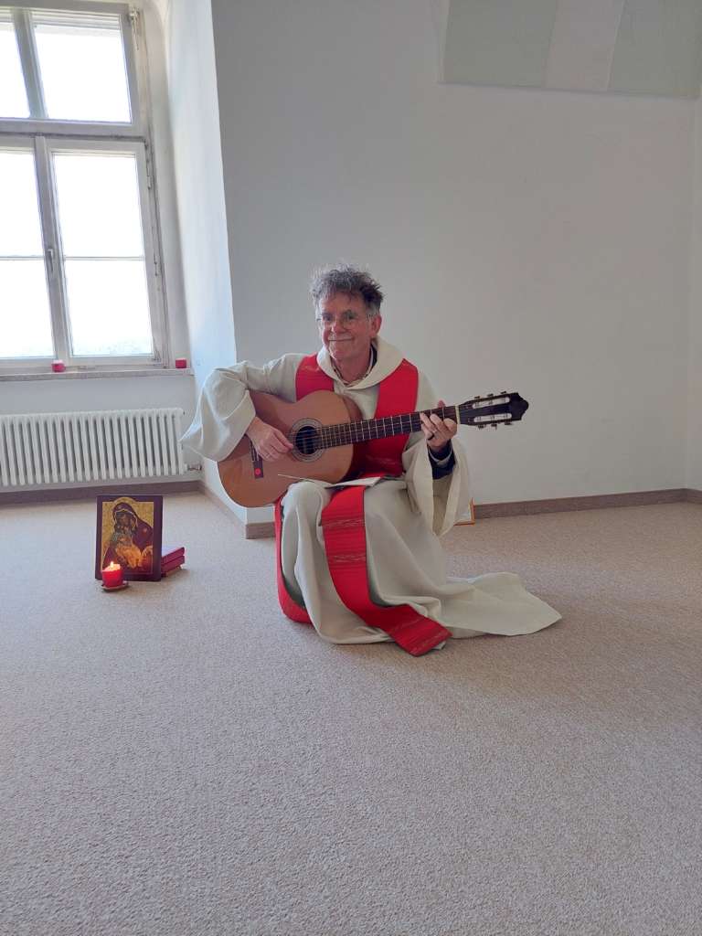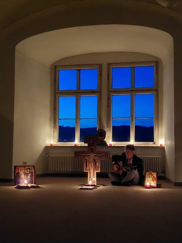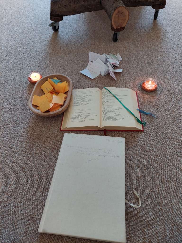 Dann folgt das Abendgebet im Meditationsraum mit dem Entzünden von Kerzen für bestimmte Lebenssituationen oder Menschen. Gebetsanliegen können wir in ein Buch einschreiben und wer will, kann einen Einzelsegen von Heinz empfangen.