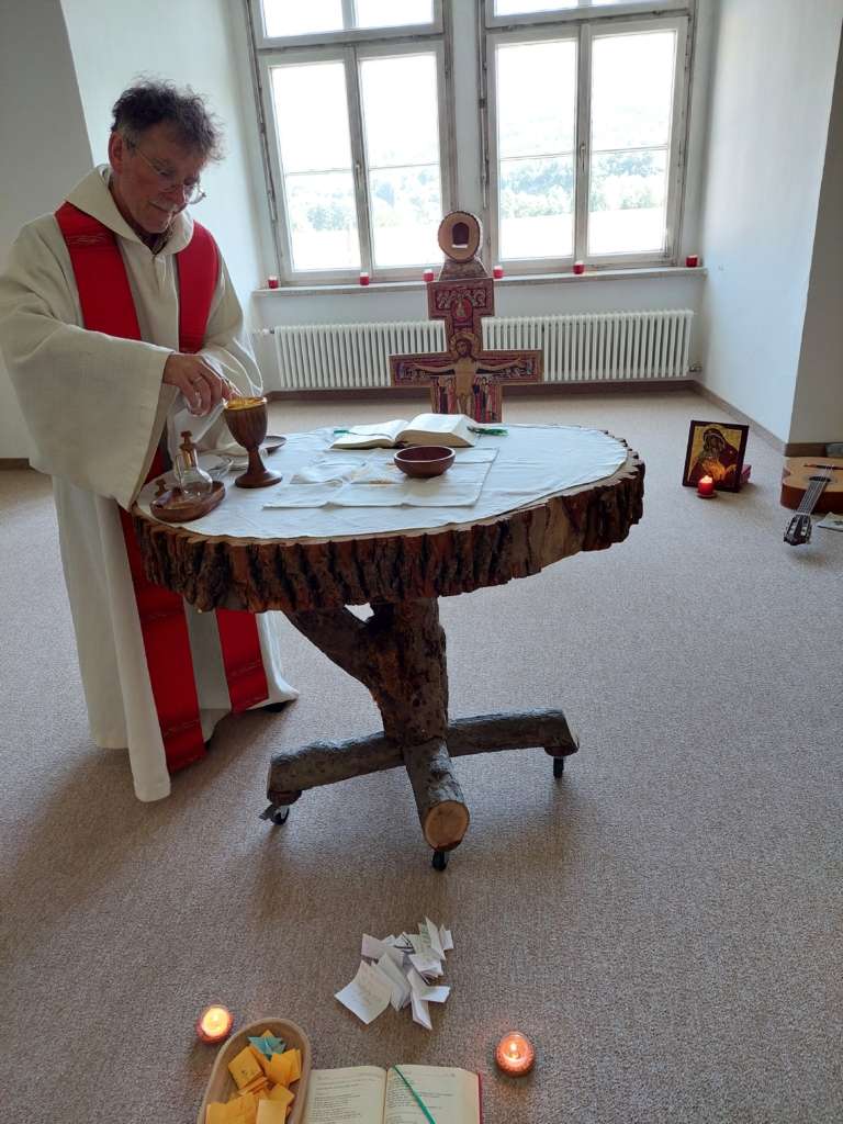 Im Meditationsraum feiern wir als krönenden Abschluss gemeinsam Eucharistie, wobei wir unsere persönlich formulierten Bitten und Dankesworte im Gebet vor Gott bringen.