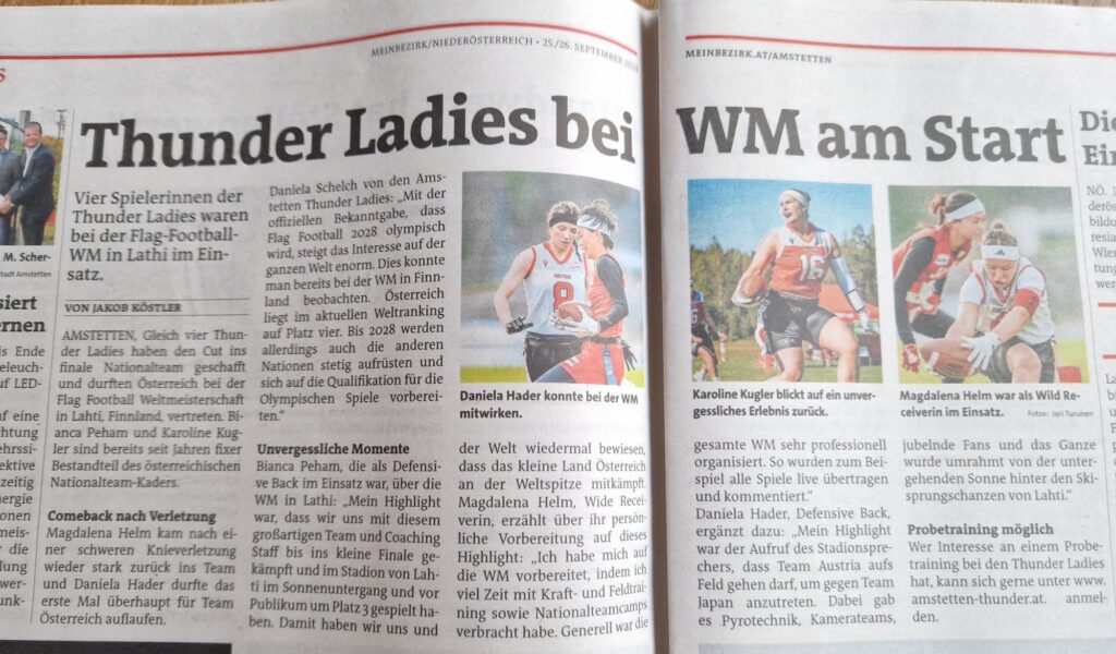 Magdalena Helm, eine Schülerin unserer Maturaklasse, ist Teil der österreichischen Damen-Nationalmannschaft im Flag Football. Bei der Weltmeisterschaft in finnischen Lahti konnte sie mit ihren Teamkolleginnen den hervorragenden vierten Platz erreichen.